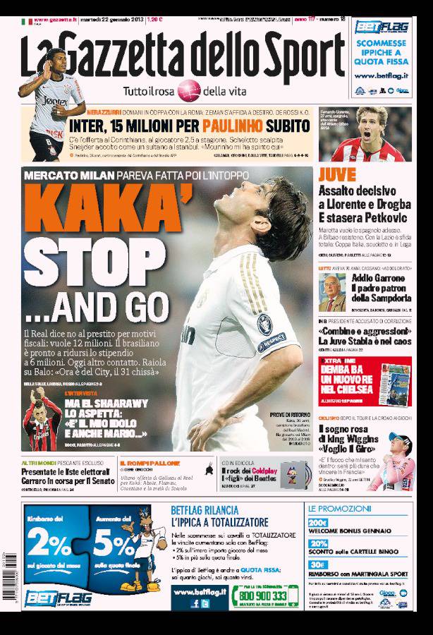 Gazzetta dello Sport: Kakà stop and Go… 22/01/2013 di Admin3 GAZZETTA KAKA’ – L’affare Kakà è saltato, lo ha dichiarato ufficialmente Galliani. Soliti motivi fiscali. La redazione di Calciomercatonews.com