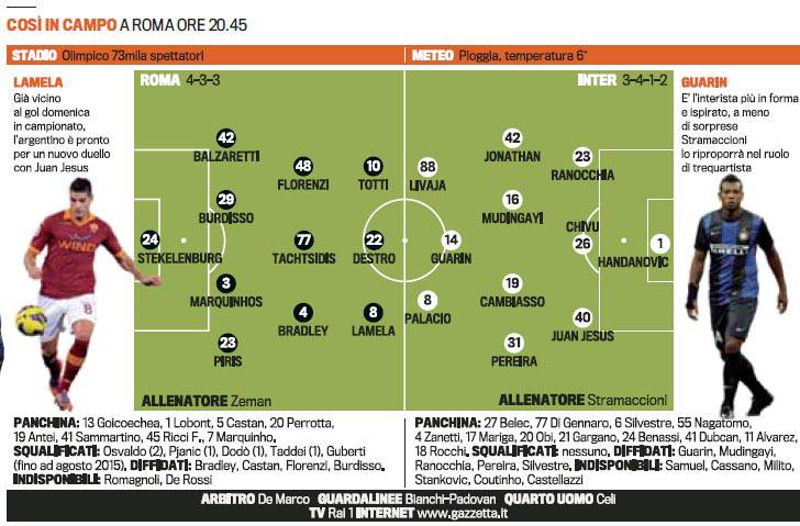 ROMA INTER PROBABILI FORMAZIONI – Poco più in basso potrete visionare le probabili formazioni di Roma-Inter firmate Gazzetta dello Sport, gara valevole per le semifinali di andata di Coppa Italia che si giocherà questa sera, ore 20.45, allo stadio Olimpico di Roma. Nerazzurri ancora in emergenza con la coppia d’attacco Livaja-Palacio, già vistasi all’opera domenica sera sempre contro i giallorossi. Mudingayi partirà dal primo minuto mentre resto della formazione come da copione. In casa Roma chance dal primo minuto per Destro, grande ex del match.