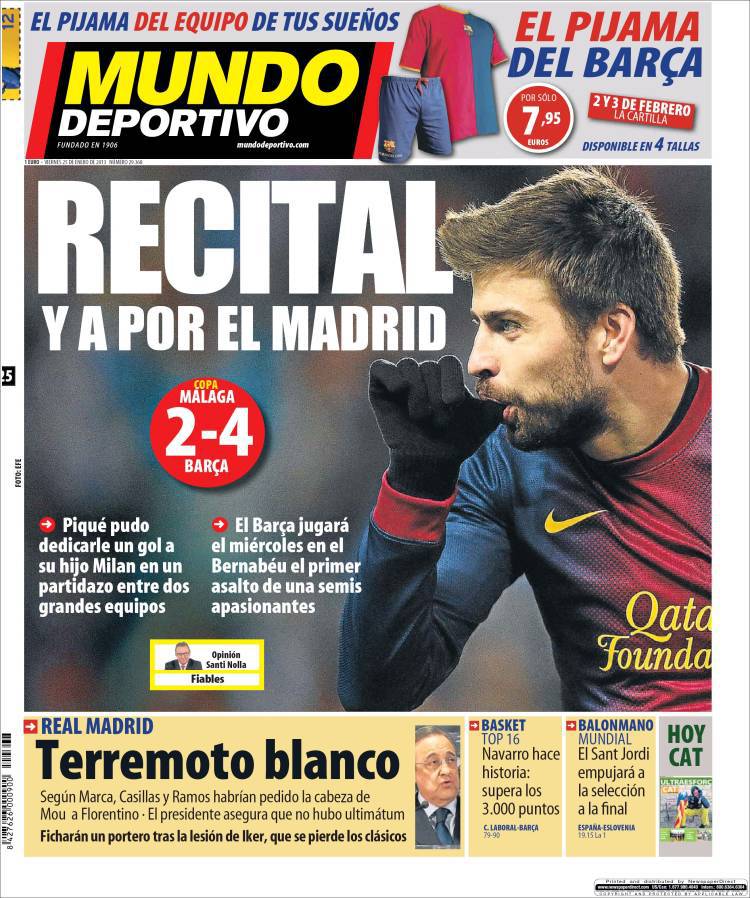 MUNDO DEPORTIVO REAL MADRID – Sul quotidiano Mundo Deportivo si parla del Barcellona che vince quattro a due contro il Malaga e in semifinale di Coppa del Re affronterà il Barcellona.