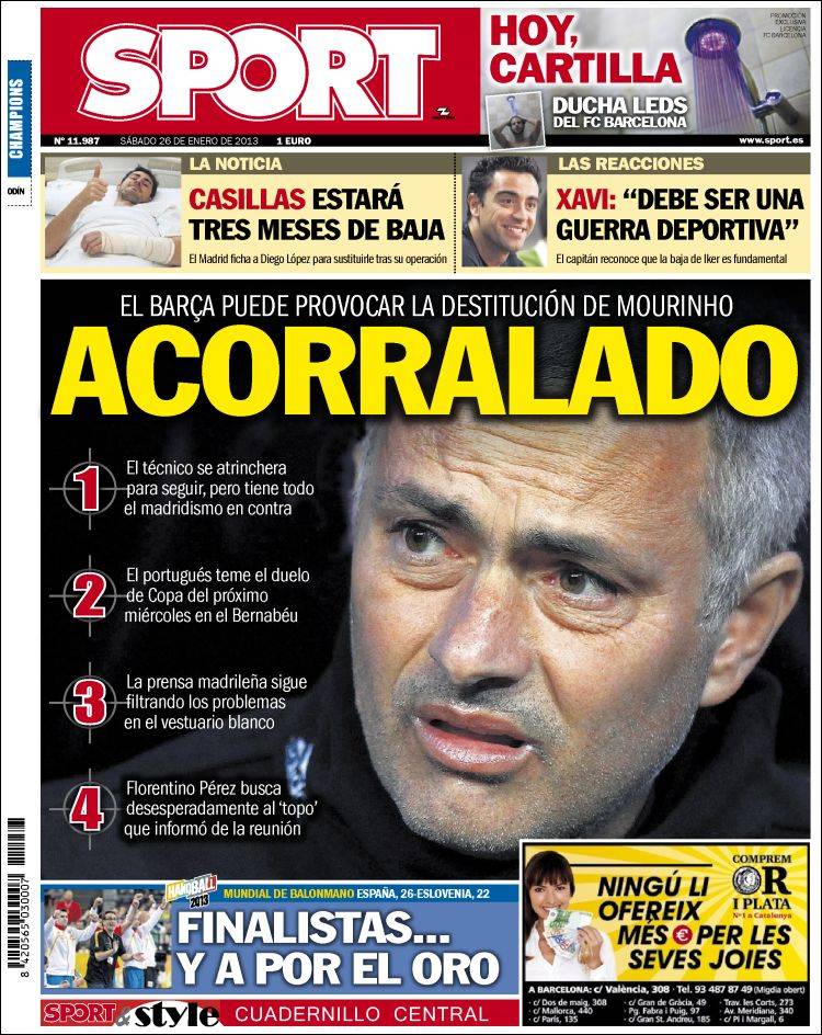 SPORT MOURINHO – Il Barcellona potrebbe favorire l’esonero di Mourinho se mercoledì in Coppa del Re vincerà contro il Real Madrid.