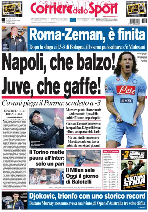 CORRIERE NAPOLI JUVENTUS – Sul Corriere dello Sport si parla del Napoli che vince a Parma e si porta a meno tre dalla Juventus.