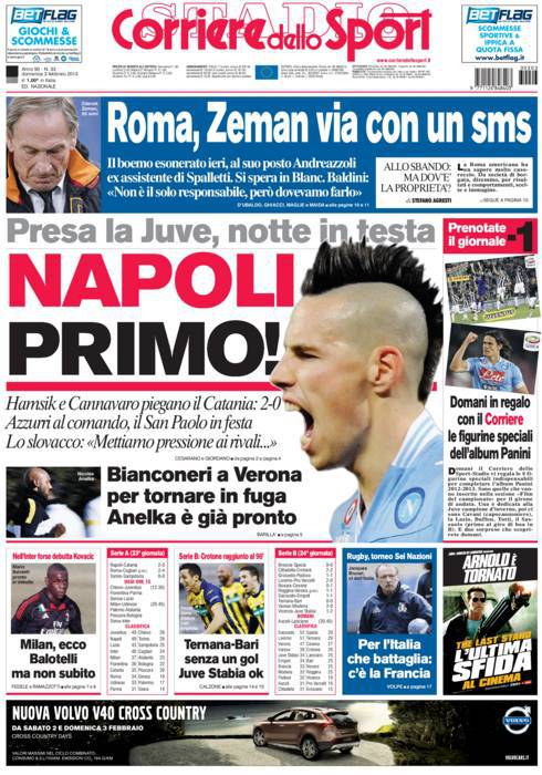 CORRIERE DELLO SPORT NAPOLI PRIMO – Notte in testa alla classifica per il Napoli, come riportato stamani dal Corriere dello Sport.