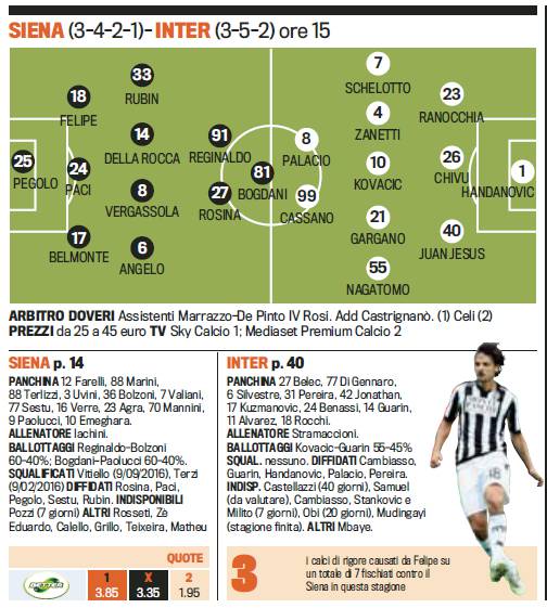 SIENA INTER PROBABILI FORMAZIONI – Poco più in basso troverete le probabili formazioni di Siena-Inter firmate Gazzetta dello Sport, partita che si giocherà questo pomeriggio alle ore 15.00 in quel dell’Artemio Franchi di Siena. Grandi novità in casa nerazzurra visto che Stramaccioni manderà in campo fin dal primo minuto Ezequiel Schelotto sulla fascia destra, nonchè il talentino Kovacic, che partirà in regia da titolare. Subito una grande chance quindi per il giovane ex Dinamo Zagabria. Attacco con Cassano e Palcio (Milito è out), mentre in difesa solito trio Juan Jesus, Chivu, Ranocchia.