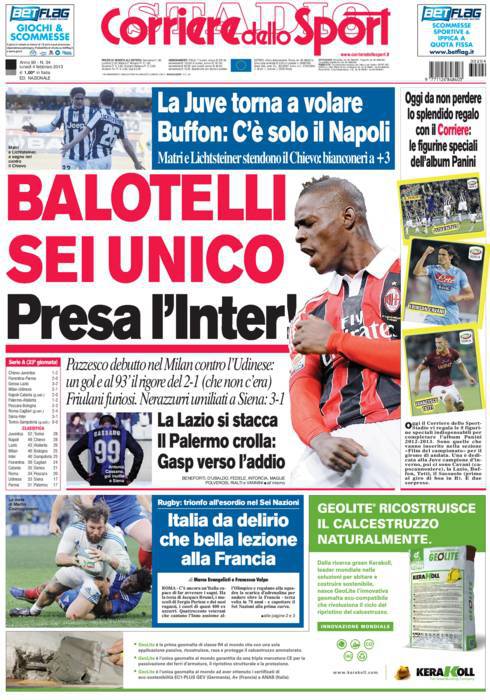 CORRIERE BALOTELLI – SuperMario subito decisivo con il Milan. Doppietta all’Udinese, agganciata l’Inter.