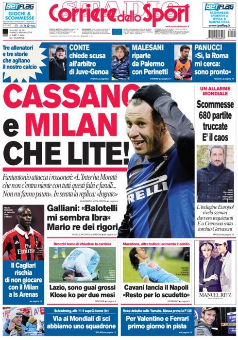 CORRIERE CASSANO MILAN – Sul Corriere dello Sport si parla di Cassano che litiga con il Milan.
