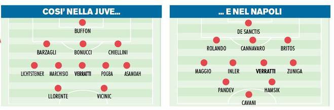 CALCIOMERCATO NAPOLI JUVENTUS VERRATTI FOTO – Il Corriere dello Sport si è divertito a inserire Marco Verratti nell’undici titolare di Napoli e Juventus in vista di un possibile arrivo del giocatore nella prossima stagione. Nel Napoli il giocatore italiano del Psg giocherebbe centrale nel centrocampo a quattro di Mazzarri al posto di Behrami con Inler accanto. Più facile però che sia proprio Inler a lasciar spazio al giovane calciatore italiano. Per quanto riguarda la Juventus, Verratti è l’erede naturale di Pirlo quindi giocherebbe al posto del centrocampista italiano. Solo fantasia? Il calciomercato può fare tutto.