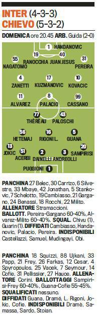 INTER CHIEVO PROBABILI FORMAZIONI – Poco più in basso potrete visionare le probabili formazioni di Inter-Chievo firmate Gazzetta dello Sport, gara che si giocherà domenica, valevole per la ventiquattresima giornata di Serie A. Mister Stramaccioni potrebbe cambiare modulo, passando ad un 4-3-3 con i nuovi arrivati Kuzmanovic e Kovacic dal primo minuto. Squalificati Chivu e Guarin in attacco si vedranno Palazio-Cassano-Alvarez anche se il Principe Milito scalpita. Infine la difesa con Ranocchia e Juan Jesus al centro nonchè Nagatomo e Pereira sugli esterni.
