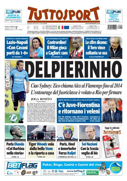 TUTTOSPORT DEL PIERO – Su Tuttosport si parla di Del Piero che sta per lasciare il Sidney per volare in Brasile al Flamengo.