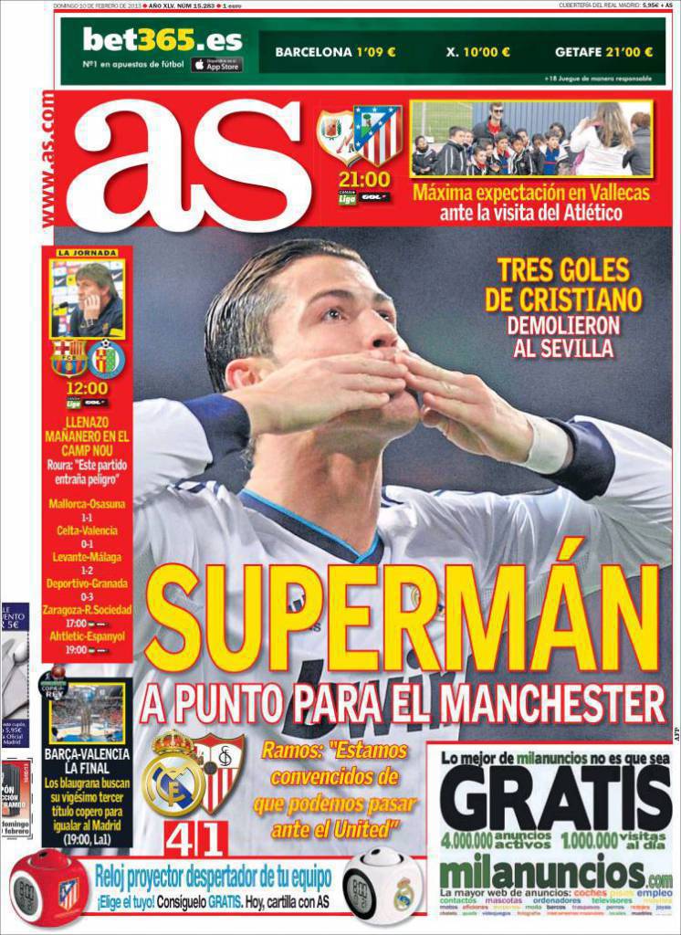 REAL MADRID CRISTIANO RONALDO MANCHESTER UNITED – Tre gol di Cristiano Ronaldo consentono al Real Madrid e a Josè Mourinho di liquidare in fretta la pratica Siviglia e poter pensare già alla gara di Champions contro il Manchester United dove Cristiano Ronaldo arriva particolarmente in forma. Sergio Ramos: “Siamo convinti di poter passare il turno contro il Manchester United”.