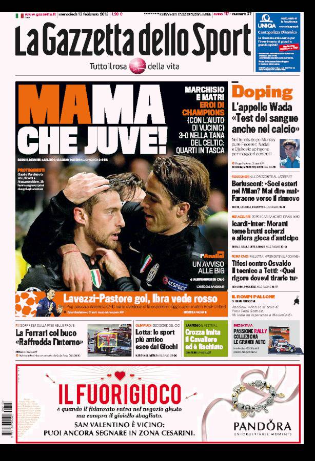 Gazzetta dello Sport: MAMA che Juve 13/02/2013 di Admin3 GAZZETTA JUVENTUS – Sulla Gazzetta dello Sport si parla della Juventus che vince tre a zero contro il Celtic e ipoteca il passaggio ai quarti. La redazione di Calciomercatonews.com