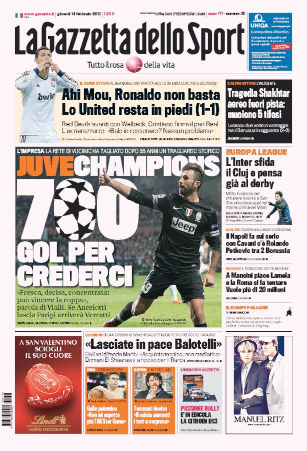 Gazzetta dello Sport: 700 gol per crederci 14/02/2013 di Admin3 GAZZETTA JUVENTUS – Sulla Gazzetta dello Sport si parla della Juventus che può credere nel colpo Champions. la redazione di Calciomercatonews.com
