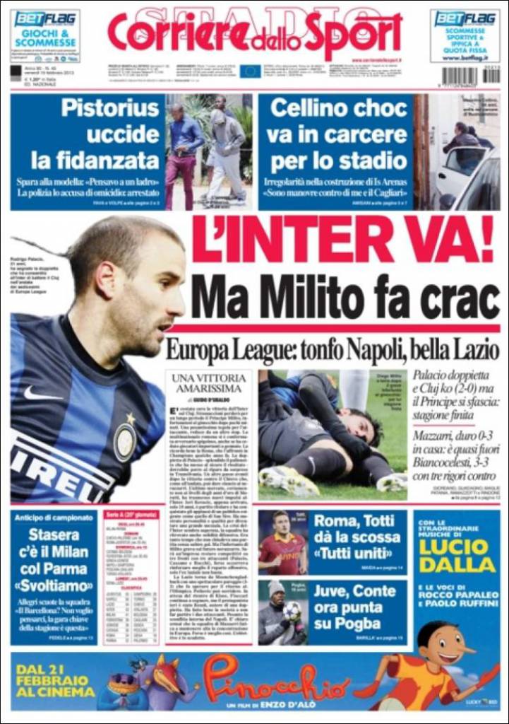 INTER MILITO INFORTUNIO – Palacio segna una doppietta e il Cluj va ko (2-0) ma il Principe si sfascia: stagione finita. Europa League: tonfo Napoli, bella Lazio. Mazzarri, duro 0-3 in casa, è quasi fuori. Biancocelesti 3-3 con tre rigori contro. Cellino choc: va in carcere per lo stadio. Irregolarità nella costruzione di Is Arenas: “Sono manovre contro di me e il Cagliari”.