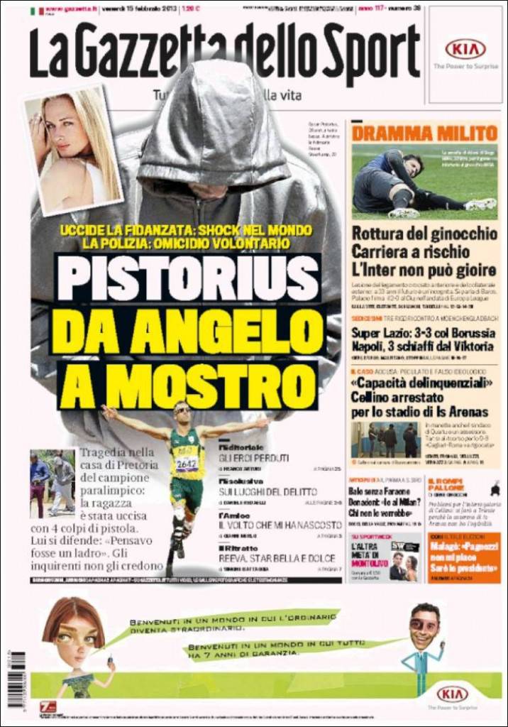 Gazzetta dello Sport: Pistorius, da angelo a mostro. Dramma Milito