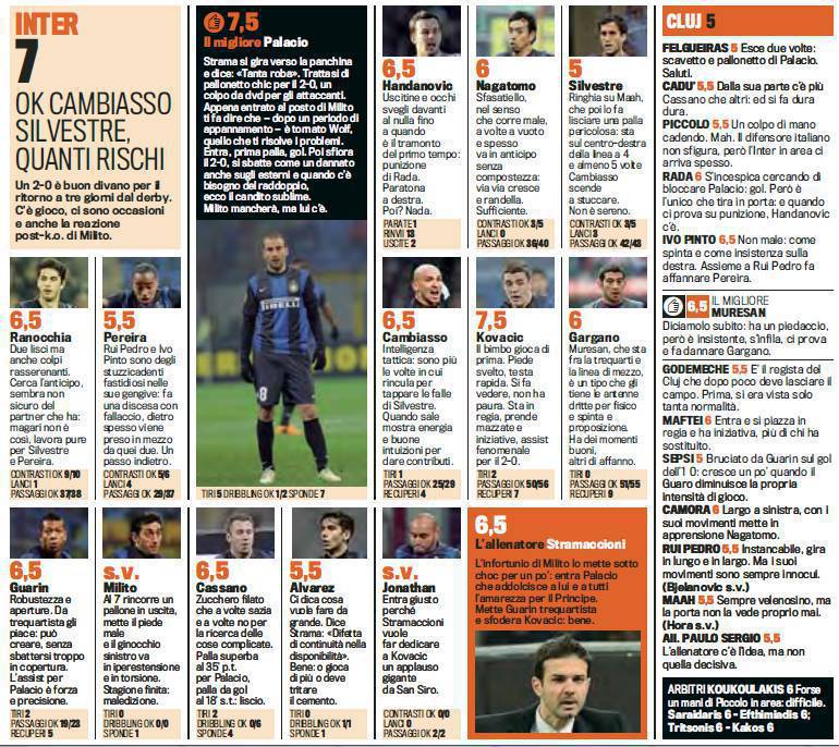 INTER CLUJ VOTI PAGELLE GAZZETTA SPORT – Poco più in basso potrete visionare i voti e le pagelle Gazzetta dello Sport relativi alla sfida Inter-Cluj, gara giocatasi ieri sera a San Siro, conclusasi con il risultato di 3 a 0 in favore dei nerazzurri, valevole per i sedicesimi di andata di Europa League. Migliore in assoluto dell’incontro è stato Rodrigo Palacio, autore di una splendida doppietta. Molto bene anche il gioiellino croato Kovacic, che ha regalato grandi palle ai compagni fra cui un assist vincente. Molto bene, infine, il solito Samir Handanovic.