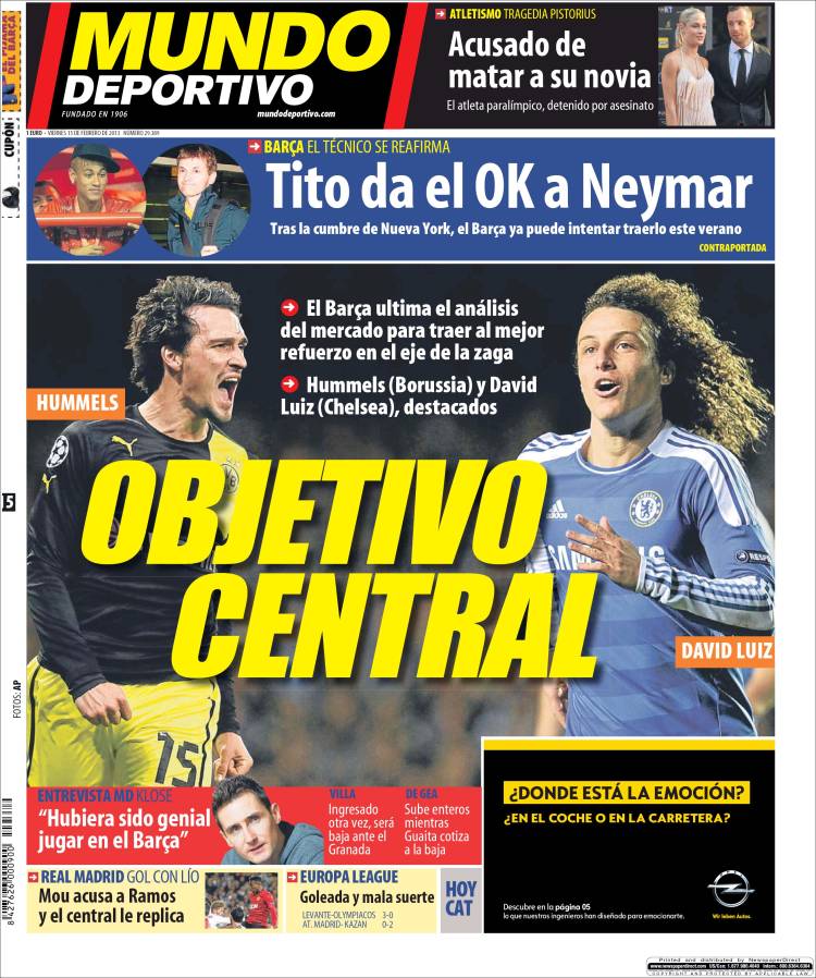 CALCIOMERCATO BARCELLONA . In casa Barcellona si pensa già al mercato per la prossima stagione. Il tecnico Vilanova ha dato l’ok per l’arrivo del brasiliano Neymar ma gli uomini di mercato blaugrana sono alla ricerca di un difensore centrale. Gli obiettivi sono Hummels del Borussia e David Luiz del Chelsea.