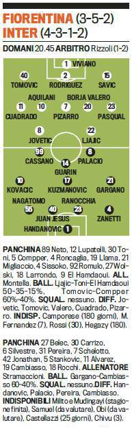 FIORENTINA INTER PROBABILI FORMAZIONI STRAMACCIONI – Domani sera l’Inter affronterà la Fiorentina nella 25esima giornata di Serie A. I nerazzurri del tecnico Stramaccioni cercheranno la vittoria su un difficile campo come quello della Fiorentina di Montella. I nerazzurri punteranno nuovamente sul giovane talento Kovacic che agirà a centrocampo come interno sinistro. Conferma anche per l’ex Kuzmanovic che giocherà centrale di centrocampo. Nella Fiorentina invece accanto a Jovetic ci sarà Ljajic. Ecco le probabili formazioni secondo la Gazzetta dello Sport.