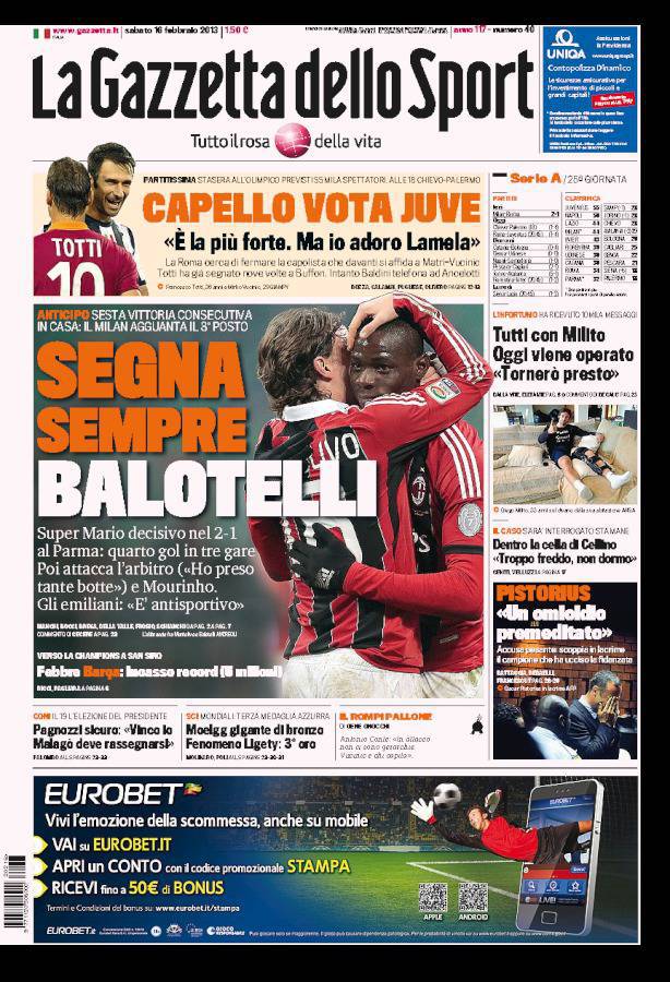 GAZZETTA BALOTELLI – Sulla Gazzetta dello Sport si parla di Balotelli che segna ancora con la maglia del Milan. Terzo posto agguantato.