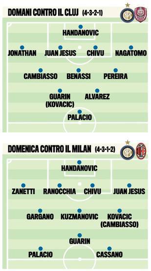 INTER CLUJ MILAN FOTO – Domani contro il Cluj e domenica nel derby contro il Milan. L’Inter si gioca molto in questi giorni visto che domani andrà in Romania per il ritorno dei sedicesimi di finale di Europa League. All’andata i nerazzurri hanno vinto due a zero con la doppietta di Palacio. Stramaccioni dovrà dosare le forze visto l’impegno nel derby per questo manderà due formazioni diverse. Contro il Cluj spazio all’alberto di Natale e riposo per Cassano che invece sarà regolarmente in campo al derby. A centrocampo rientrerà Benassi contro i romeni, mentre in campionato Gargano tornerà in campo. Ecco le foto del Corriere dello Sport.