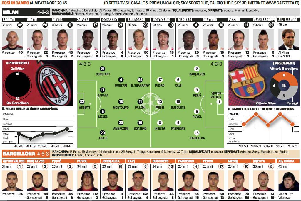 MILAN BARCELLONA PROBABILI FORMAZIONI – Di seguito troverete le probabili formazioni de La Gazzetta dello Sport dell’attesissimo Milan-Barcellona, sfida che si terrà questa sera allo stadio San Siro, ore 20.45, e sarà valida per l’andata degli ottavi di finale di Champions League. Allegri punta su Boateng in attacco (Niang in panca), al fianco di El Shaarawy e Pazzini. A centrocampo, causa assenza di Flamini e Nocerino, il tecnico rossonero punterà su Ambrosini e Muntari, al fianco naturalmente di Riccardo Montolivo. In difesa, infine, spazio alla coppia di centrali Zapata-Mexes.