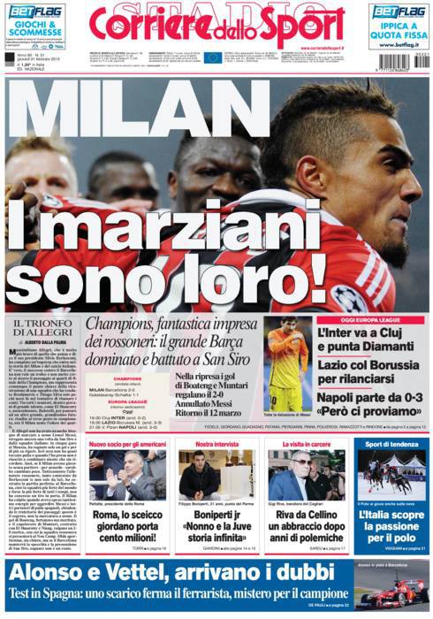 CORRIERE MILAN – Sul Corriere dello Sport si parla del Milan che vince due a zero contro il Barcellona nell’andata degli ottavi di finale di Champions League.