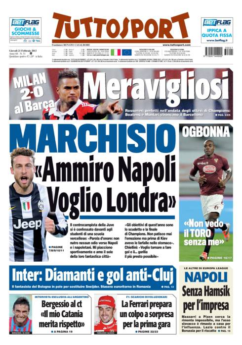 TUTTOSPORT MARCHISIO – Su Tuttosport si parla di Marchisio che ammira Napoli ma sogna la finale di Londra di Champions.
