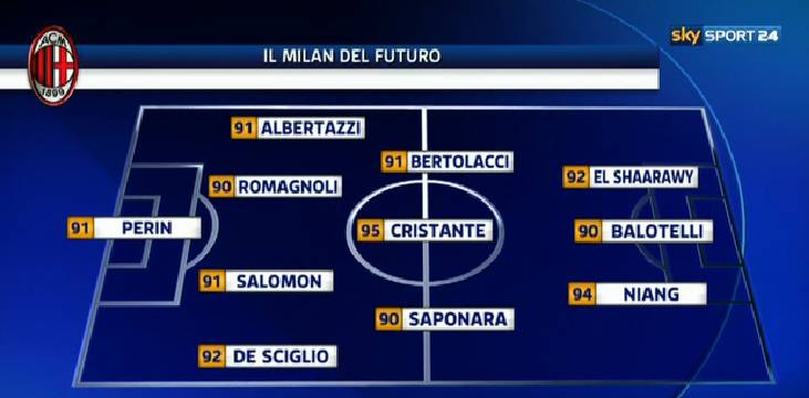 CALCIOMERCATO MILAN SQUADRA 2013/2014 – La redazione di Sky Sport ha giocato su quella che potrebbe essere la formazione del Milan per la stagione 2013/2014. Quello che salta agli occhi è una formazione giovanissima ma di talento anche se difficilmente tutti gli elementi arriveranno a Milanello. In porta abbiamo Perin, nel mirino del Milan da diverso tempo; in difesa Albertazzi, Romagnoli, Salomon e De Sciglio; a centrocampo Bertolacci, Cristante e Saponara; in attacco El Shaarawy, Balotelli e Niang.