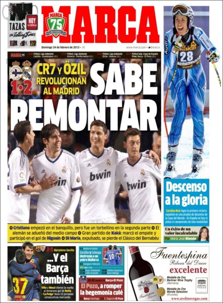 DEPORTIVO LA CORUNA REAL MADRID – Cristiano Ronaldo e Ozil protagonisti della rimonta del Real Madrid contro il Deportivo La Coruna, battuto per -. Cristiano Ronaldo parte dalla panchina ma è un uragano nel secondo tempo. I tedesco ha preso in mano le redini del centrocampo. Grande partita di Kakà: ha segnato il gol del pareggio e partecipato all’azione del gol di Higuain. Colpo di testa di Di Maria che si fa espellere prendendo due gialli in nove secondi: salterà il match Ral Madrid-Barcellona.