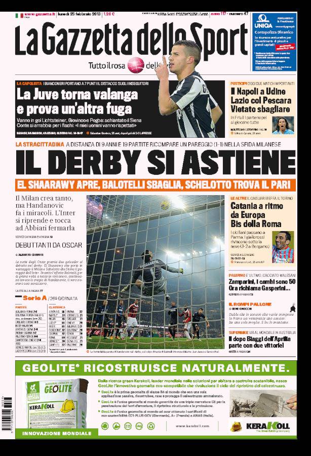 GAZZETTA DERBY – Finisce uno a uno il derby tra Inter e Milan, a El Shaarawy risponde Schelotto.