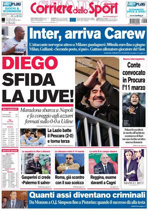 CORRIERE DIEGO JUVENTUS – Sul Corriere dello Sport si parla di Maradona che ieri è sbarcato in Italia.