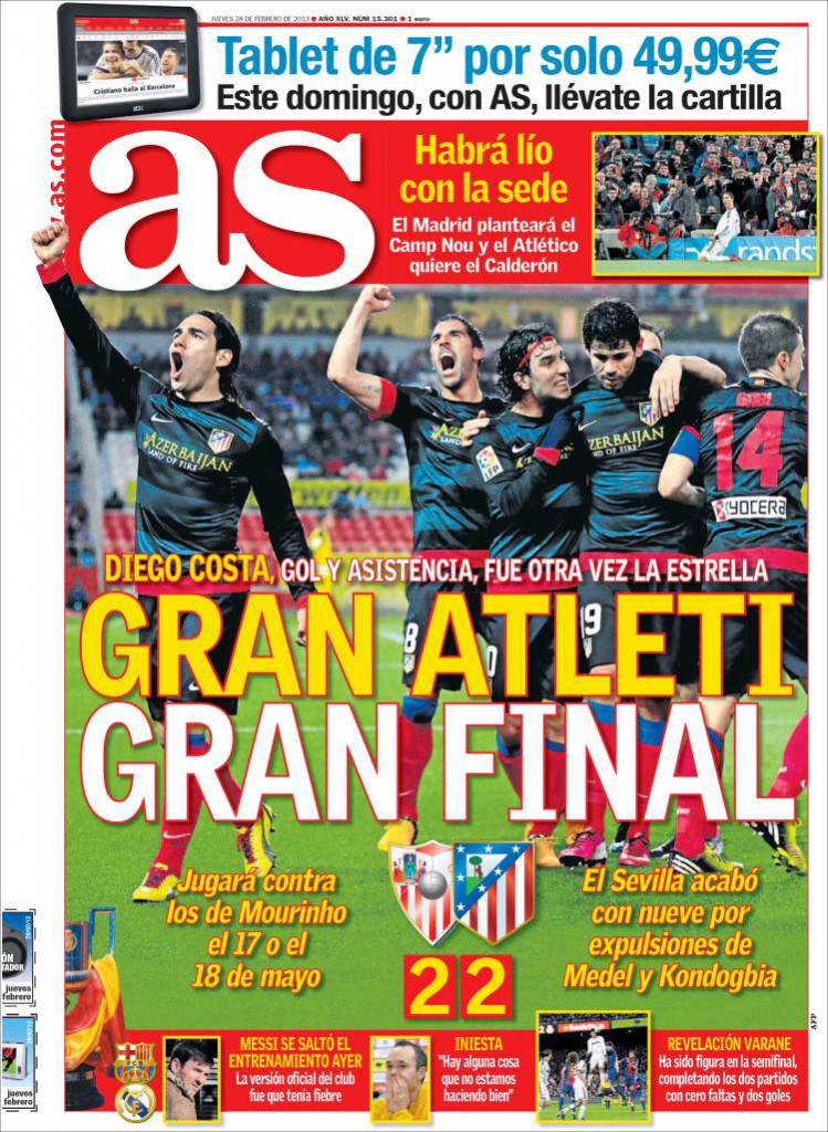 AS ATLETICO MADRID – Sul quotidiano As si parla dell’Atletico Madrid che si ritroverà contro il Real Madrid in finale di Coppa del Re.