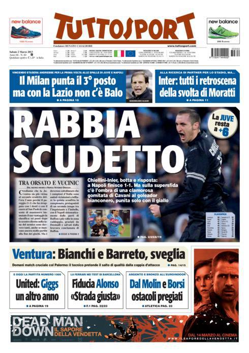 TUTTOSPORT SCUDETTO – La Juventus pareggia uno a uno a Napoli contro i partenopei. Prova d’orgoglio dei bianconeri.