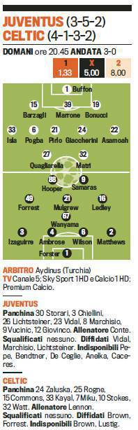 JUVENTUS CELTIC PROBABILI FORMAZIONI CONTE QUAGLIARELLA – Il tre a zero dell’andata al Celtic Park potrebbe condizionare la Juventus. Per questo Antonio Conte, tecnico della Juventus, ha chiesto ai suoi giocatori molta prudenza nell’affrontare il ritorno degli ottavi di finale di Champions League. L’allenatore salentino farà un ampio turnover per dare spazio a chi gioca di meno, in difesa al centro Marrone al posto di Chiellini che non sta bene fisicamente. A centrocampo ritorna Isla esterno a destra, al centro Giaccherini e Pogba al posto di Vidal e Marchisio. In attacco Quagliarella torna in campo dal primo minuto.