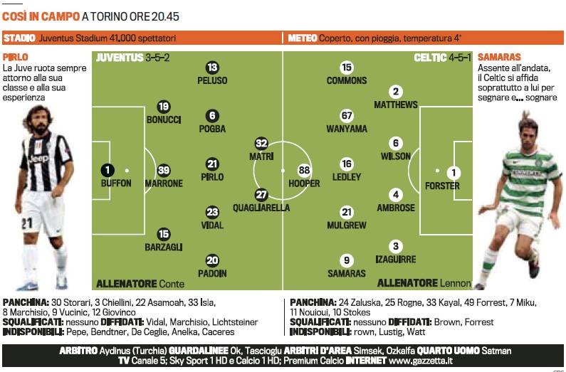 JUVENTUS CELTIC PROBABILI FORMAZIONI – Poco più in basso potrete visionare le probabili formazioni firmate Gazzetta dello Sport di Juventus-Celtic, sfida che si terrà questa sera a Torino alle ore 20.45 e che sarà valevole per il ritorno degli ottavi di Champions League. Antonio Conte, fra diffidati e turnover, manderà in campo un 11 un po’ diverso rispetto al solito con la coppia d’attacco Quagliarella-Matri, e con Padoin e Peluso sugli esterni di centrocampo. In mezzo alla difesa, spazio a Marrone spalleggiato da Barzagli e Bonucci.