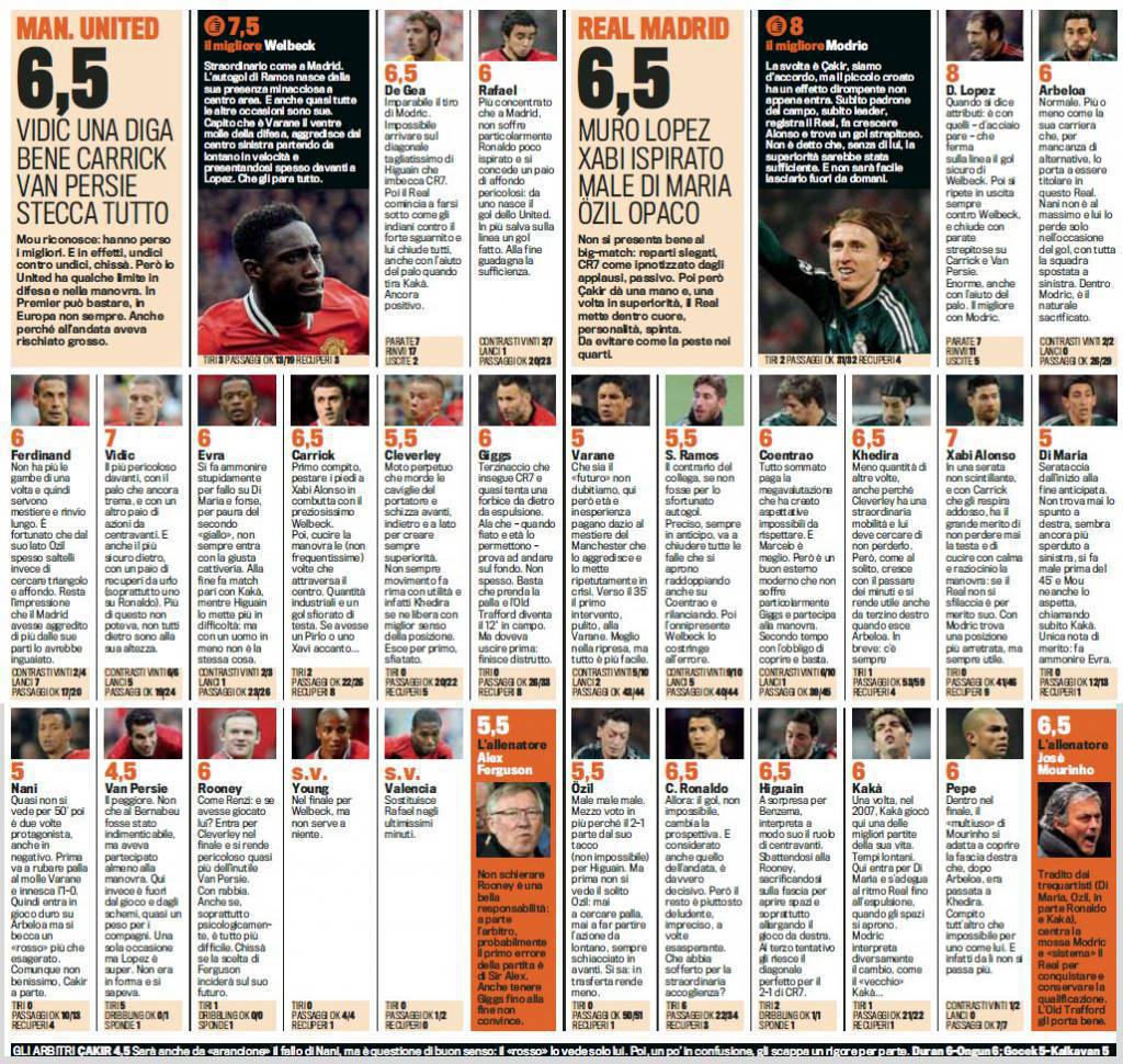 MANCHESTER UNITED REAL MADRID VOTI PAGELLE GAZZETTA – Il Manchester United perde in casa due a uno contro il Real Madrid ed esce fuori dalla Champions League. Mourinho vola ai quarti di finale anche grazie all’incredibile espulsione rimediata da Nani. Nel Real Madrid grandissima prova di Modric e del portiere Diego Lopez, bene Ronaldo autore di un gol. Nel Manchester United migliore in campo Welbeck, mentre malissimo Van Persie che sbaglia praticamente tutto. Rooney entra nel finale e cerca di aiutare lo United ma passa il Real Madrid. Voti e pagelle della Gazzetta dello Sport.