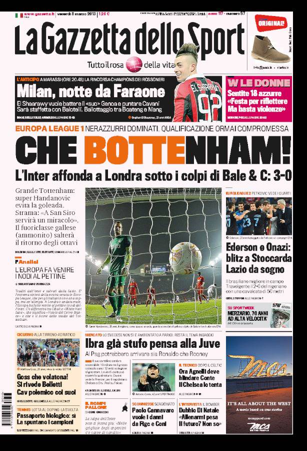 GAZZETTA INTER – Tracollo Inter a Londra contro il Tottenham. Tre a zero il punteggio finale, nerazzurri ormai fuori dall’Europa League.