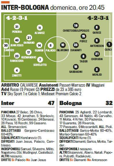 INTER BOLOGNA PROBABILI FORMAZIONI CASSANO ALVAREZ – L’Inter domenica sera affronterà il Bologna in campionato e cercherà di portare a casa i tre punti sperando in un passo falso del Milan di Allegri che questa sera giocherà a Marassi contro il Genoa. Il tecnico dell’Inter Stramaccioni confermerà il 4-2-3-1 con Palacio unica punta, i tre trequartisti saranno Alvarez a sinistra, Guarin al centro e Schelotto a destra. A centrocampo confermato Kuzmanovic con Gargano, mentre in difesa ritorna la coppia titolare Ranocchia-Juan al centro della difesa. Nel Bologna occhi puntati su Diamanti che il prossimo anno potrebbe vestirsi di nerazzurro. Le formazioni secondo la Gazzetta dello Sport.