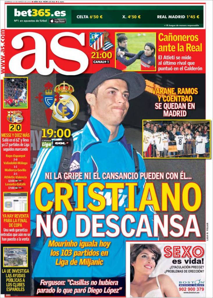 REAL MADRID CRISTIANO RONALDO MOURINHO – Nonostante sia reduce dall’influenza e cominci a sentire la stanchezza, Josè Mourinho non rinuncia a Cristiano Ronaldo che è partito con la squadra per il match valido per la 27ma giornata della Liga contro il Celta Vigo. Sono rimasti a Madrid Varane, Sergio Ramos e Coentrao.