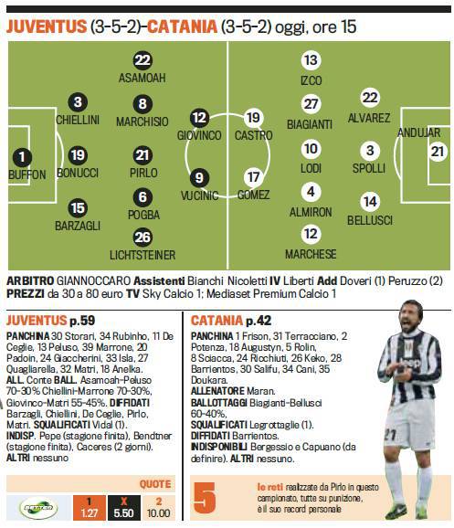 JUVENTUS CATANIA PROBABILI FORMAZIONI – Con la qualificazione ai quarti di Champions in tasca, la Juventus può pensare al campionato. Allo Juventus Stadium arriva il Catania, una delle formazioni più in forma del momento. Conte si affida ancora al 3-5-2 con Buffon tra i pali; Chiellini, Bonucci e Barzagli in difesa; Asamoah, Marchisio, Pirlo, Pogba e Lichsteiner a centrocampo mentre in attacco tornano Giovinco e Vucinic. Anche Maran sceglie il 3-5-2 con Andujar tra i pali; Alvarez, Spolli e Bellusci in difesa; Izco, Biagianti, Lodi, Almiron e Marchese a centrocampo mentre in atatcco spazio a Castro e Gomez.