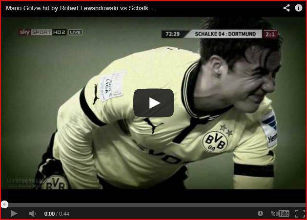 VIDEO BOTTA GOTZE – I ragazzi terribili del Borussia Dortmund, dopo la vittoria per due anni consecutivi del campionato tedesco, si stanno concentrando sulla forsennata corsa per la conquista della Champions League. In più occasioni si è detto e ripetuto che, il gruppo allenato da Jurgen Klopp, sebbene formato da diversi giovani sia un gruppo con gli attributi. E proprio di attributi, o in questo caso di una pallonata lì dove non batte il sole, parliamo. Il bomber dei gialloneri Robert Lewandowski, ha involontariamente colpito con una sassata tremenda, il numero 10 del Borussia Mario Gotze, durante il match perso contro lo Schalke 04 ieri pomeriggio. In questo caso, siamo certi, Gotze ha dimostrato di essere un uomo all’altezza della squadra allenata da Klopp… Ecco il video dell’accaduto: