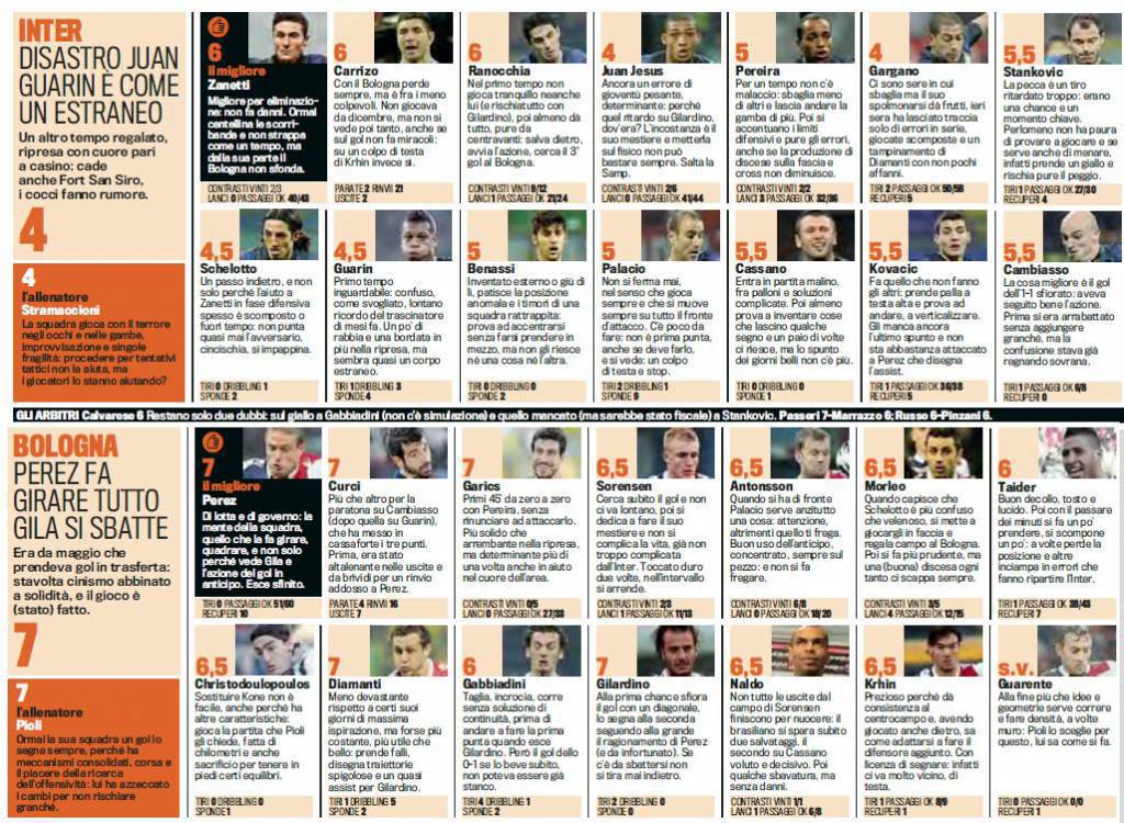 INTER BOLOGNA VOTI PAGELLE GAZZETTA SPORT – Poco più in basso potrete vedere i voti e le pagelle Gazzetta dello Sport della sfida fra Inter e Bologna, gara giocatasi ieri sera a San Siro e conclusasi con il risultato di 1 a 0 in favore dei rossoblu. Prestazione disastrosa dell’Inter in particolare di Juan Jesus, colpevole sul gol di Gilardino. Male anche Gargano nonché Schelotto e Guarin. Si salva solo il solito capitan Zanetti, che ieri ha regalato la solita corsa, grinta e generosità. Peccato lo seguano in pochi…