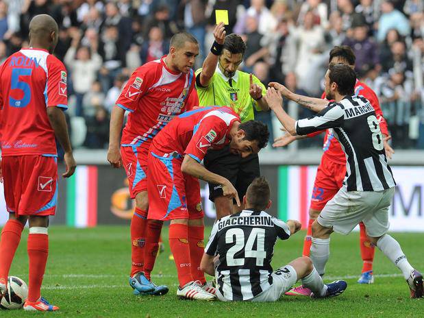 JUVENTUS CATANIA GIACCHERINI – Dopo la vittoria dell’andata, la Juventus potrebbe vedere macchiata anche la vittoria di ieri contro il Catania. Nel secondo tempo, ancora sullo 0-0, c’è un episodio dubbio in area del Catania: Alvarez interviene in scivolata su Giaccherini, c’è un contatto fra il piede sinistro del rossazzurro e il destro dello juventino che sarebbe da rigore, ma Giaccherini fa due passi, vede che non riesce più a raggiungere il pallone e si lascia cadere. Sul gol di Giaccherini che ha deciso la partita ci sono almeno due dubbi. L’azione comincia con un fallo di Barzagli a centrocampo sul quale si avventa Giaccherini per la firma tricolore; ma prima che il pallone arrivi sul piede del centrocampista bianconero, va segnalato un contatto sospetto fra Chiellini e Alvarez a due passi da Andujar.