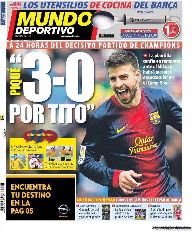 MUNDO DEPORTIVO PIQUE’ – Sul quotidiano Mundo Deportivo parla Piqué che vuole vincere tre a zero contro il Milan per dedicare la qualificazione a Tito Vilanova.