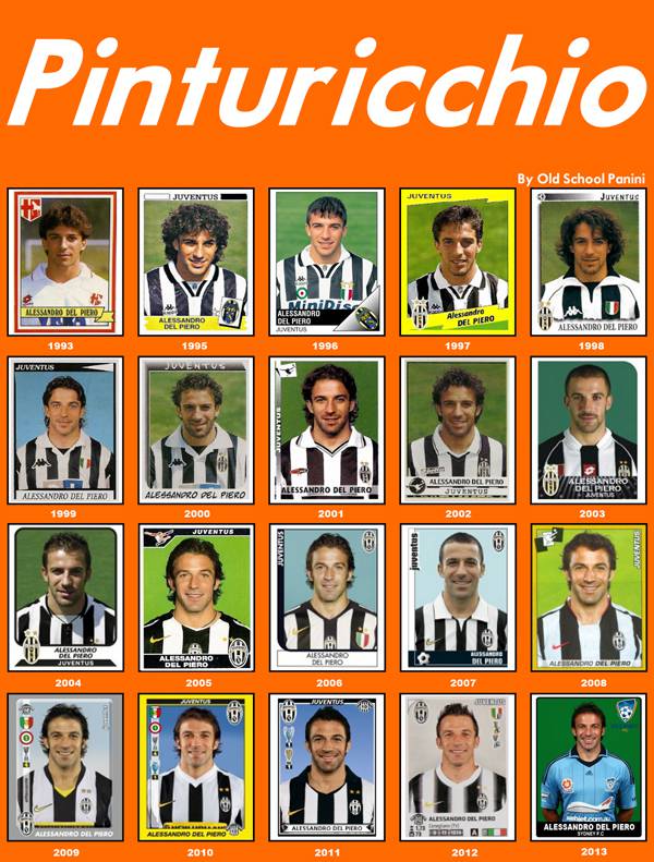 EVOLUZIONE PANINI DEL PIERO TUTTE LE FIGURINE – Per rivivere la carriera di Alessandro Del Piero attraverso le edizioni dell’Album Calciatori Panini ecco qui sotto un collage di tutte le figurine di Pinturicchio dal Padova al Sydney F.C. passando naturalmente per le stagioni nelle fila della Juventus: