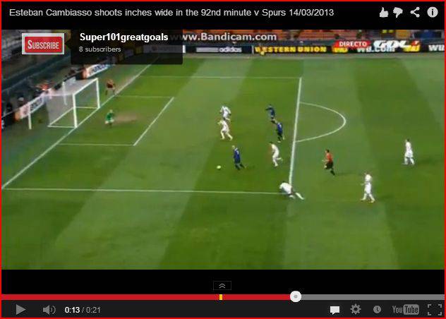 VIDEO INTER TOTTENHAM – E’ finita con il risultato di 4 a 1 in favore dell’Inter la sfida contro il Tottenham, ma il risultato non ha permesso ai nerazzurri di passare il turno, in virtù del 3 a 0 dell’andata per i londinesi. Eppure l’Inter è stata veramente ad un passo dalla remuntada. Al 92esimo, infatti, Antonio Cassano ha messo una palla d’oro per Esteban Cambiasso, che entrando in area dalla sinistra, a tu per tu con il portiere avversario, ha chiuso troppo l’angolo, facendo la barba al palo, e strozzando l’urlo di gioia dei tifosi.