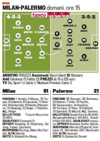 MILAN PALERMO PROBABILI FORMAZIONI TRAORE’ – Il Milan domani affronterà il Palermo alle ore 15 e cercherà in tutti i modi di vincere e continuare la cavalcata al terzo posto. I rossoneri vogliono assolutamente continuare la cavalcata al terzo posto e per farlo Allegri si affiderà a Mario Balotelli, attaccante italiano. A centrocampo ci sarà anche Traoré, la sorpresa iniziale di Allegri. Nel Palermo di Sannino invece spazio a due punte vere come Dybala e Boselli, due giocatori che potrebbero dare fastidio alla difesa del Milan. Voti e pagelle della Gazzetta dello Sport.