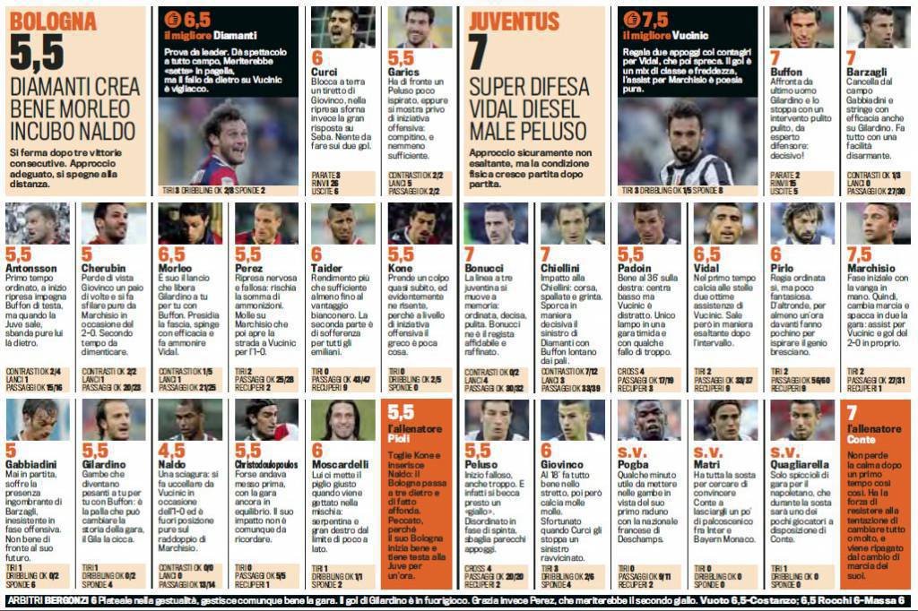 BOLOGNA JUVENTUS VOTI PAGELLE GAZZETTA SPORT – Di seguito potete visionare i voti e le pagelle Gazzetta dello Sport relativi alla sfida fra il Bologna e la Juventus, gara giocatasi ieri sera allo stadio Dall’Ara e conclusasi con il risultato di 2 a 0 in favore dei bianconeri. Grandissima prestazione di Mirko Vucinic, migliore in campo in assoluto del match autore del gol che ha sbloccato la partita e di uno splendido assist per Marchisio. Molto bene anche quest’ultimo, all’ennesima grande prova stagionale. Anche l’intera retroguardia bianconera promossa ampiamente.