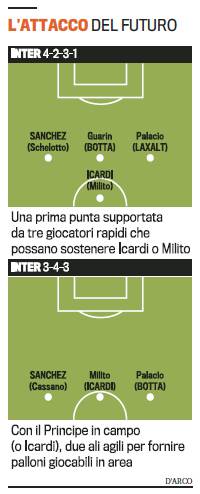 CALCIOMERCATO INTER ALEXIS SANCHEZ FOTO – A distanza di due stagioni, Alexis Sanchez potrebbe lasciare la Spagna. L’addio al Barcellona, complice la forte concorrenza in attacco, potrebbe indurre il cileno a dire addio ai blaugrana per cercare maggior fortuna altrove. A questo proposito, è di qualche giorno fa la notizia secondo cui il procuratore dell’attaccante arriverà in Italia a fine mese per una serie di incontri. In pole position per assicurarsi le sue prestazioni ci sarebbe l’Inter, che già ai tempi dell’Udinese si interessò a lui. Come mostra un’immagine tratta dalla Gazzetta dello Sport, Sanchez potrebbe essere impiegato sia come trequartista alle spalle della punta sia come ala destra in un attacco a tre.