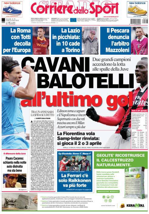 CORRIERE CAVANI BALOTELLI – Sul Corriere dello Sport si parla di Cavani e Balotelli che trascinano Napoli e Milan a suon di doppietta.