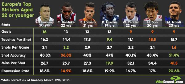 FOTO MIGLIORI BOMBER UNDER 20 EL SHAARAWY LAMELA ICARDI – Continuano le interessanti graduatorie del sito WhoScored.com che quest’oggi ci presenta una tabella coinvolgente e singolare. Vengono infatti racchiusi, in questa grafica, i migliori 7 bomber under 20 di quest’anno. Chi il migliore del lotto? Stephan El Shaarawy, attaccante rossonero che a dispetto delle voci sui problemi con Balotelli, dimostra di essere il miglior realizzatore tra i suoi pari età. Tra gli “italiani” svettano anche Erik Lamela della Roma e Maurito Icardi della Sampdoria.