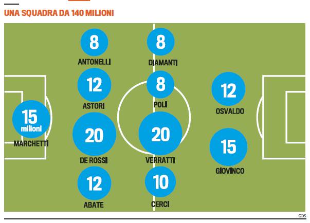 CALCIOMERCATO JUVENTUS MILAN ROMA 11 NAZIONALI FOTO – Una formazione che vale addirittura 140 milioni di euro, quella messa idealmente in campo dalla Gazzetta dello Sport, che stamani ha pubblicato un interessante immagine che racchiude i valori dei calciatori convocati in nazionale e che a giugno potrebbero lasciare le proprie attuali squadre. I maggiormente quotati sono certamente Daniele De Rossi e Marco Verratti, i quali entrambi vengono attestati intorno ai 20 milioni di euro. Un 4-4-2 da non sottovalutare affatto e che potrebbe far girare diversi milioni nella sessione estiva del calciomercato.